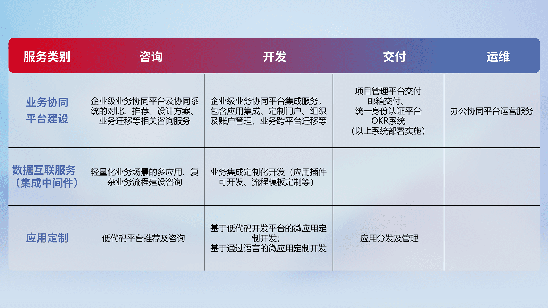 针对钉钉、、、、企微、、、IDaas等平台级产品提供产品的规划、、、方案、、交付、、、定制化开发等服务,,实现如统一协同办公、、、智能客户服务、、混合会议管理、、、、智能数据查询、、等业务场景,,,,实现数字化转型。。。